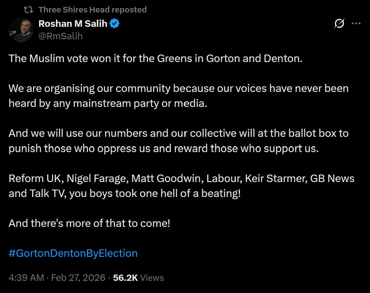 Reform is already too far gone. The lesson Reform learned from their failures in Gorton & Denton is to double down, disown their most prized candidate, and pander more to the liberal views and chase the Muslim votes harder. Astonishing but not surprising.
