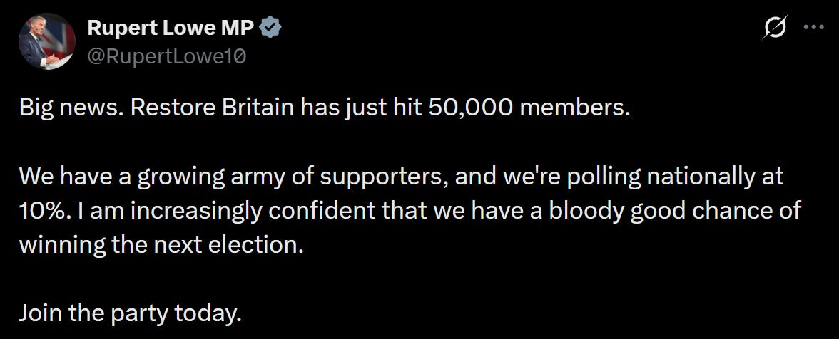 Already within 24 hours they have amassed 50k members. I suspect many would have been converts from Restore Britain as a group to Restore Britain as a political party. But it still sends a hefty message.